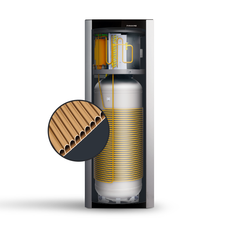 - Funcionamiento con Aerotermia, extrayendo la energía del aire y entregándoselo al agua.